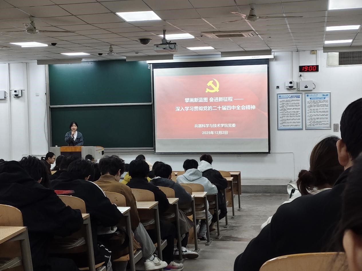 为引导2024级全体学子深学细悟党的二十届四中全会精神,精准把握“十五五”时期国防科技事业发展要求,2025年12月2日19:00,兵器科学与技术学院在教1-204教室举办“擘画新蓝图奋进新征程”专题团日活动,兵器学院团委组织部部长王星雨担任主讲人。